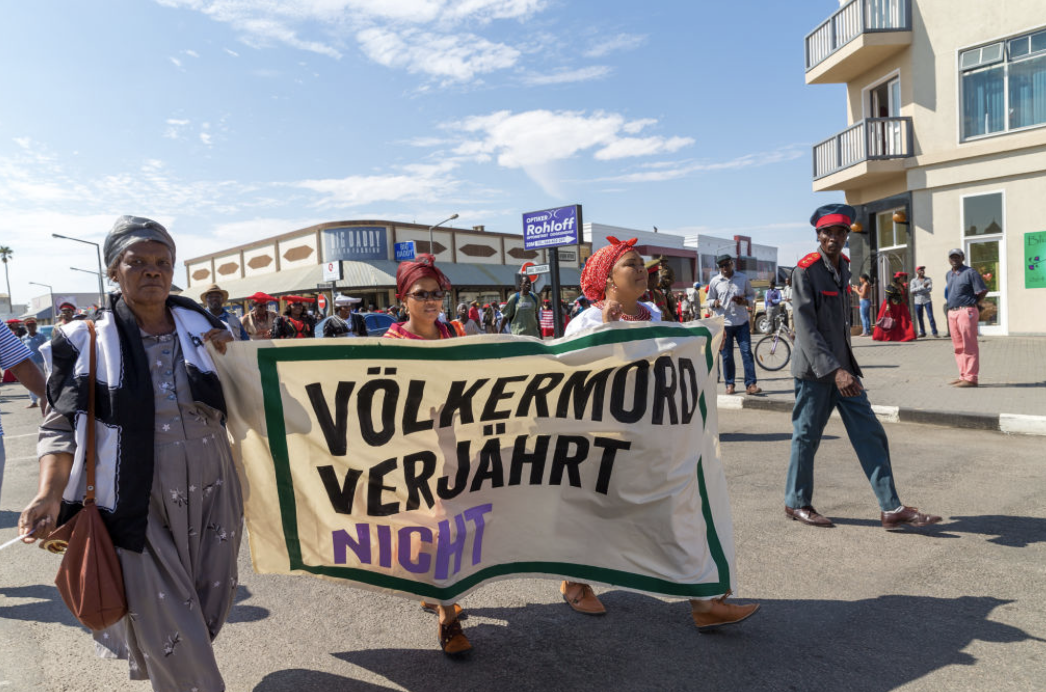 Members of the Herero and Nama communities protest against their own government for greater reparations for the genocide committed against them. A banner reads "Völkermord verjährt nicht" ("Genocide does not expire"). (Photo: © GETTY)