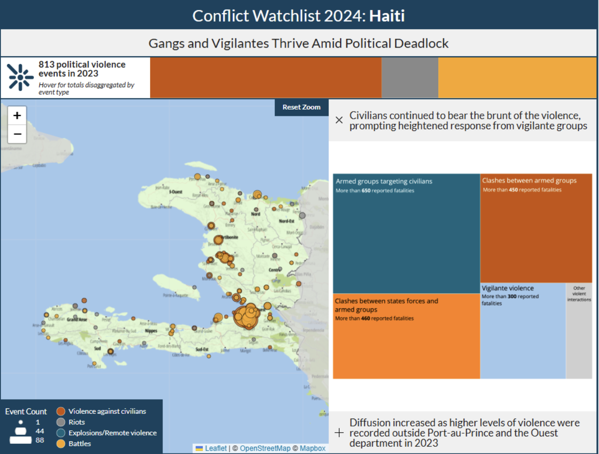 Haiti: Gangs and Vigilantes Thrive Amid Political Deadlock Conflict Map by ACLED, January 17, 2024. https://acleddata.com/conflict-watchlist-2024/haiti/.